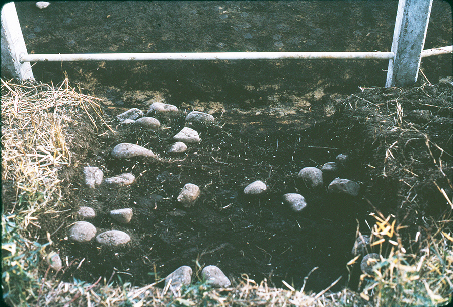 昭和50(1975)年12月3日から27日まで、湯津上村教育委員会が、下侍塚古墳の古墳外周部分で、古墳をとりまく堀である周溝(「周濠」・「周堀」ともいいます)の発掘調査を行いました。