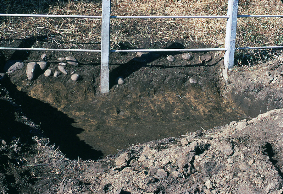 前方部の南東隅の東側で確認した周溝。古墳の周囲に掘られた幅広い溝の底面が、細長い調査区(トレンチ)の底に見えています。